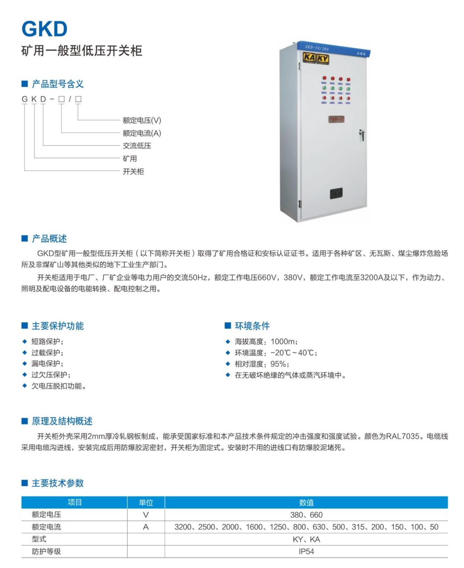 GKD型矿用一般型低压开关柜(以下简称开关柜)取得了矿用合格证和安标认证证书。适用于各种矿区、无瓦斯、煤尘爆炸危险场 所及非煤矿山等其他类似的地下工业生产部门。开关柜适用于电厂、厂矿企业等电力用户的交流50Hz, 额定工作电压660V,380V, 额定工作电流至3200A 及以下,作为动力、 照明及配电设备的电能转换、配电控制之用。