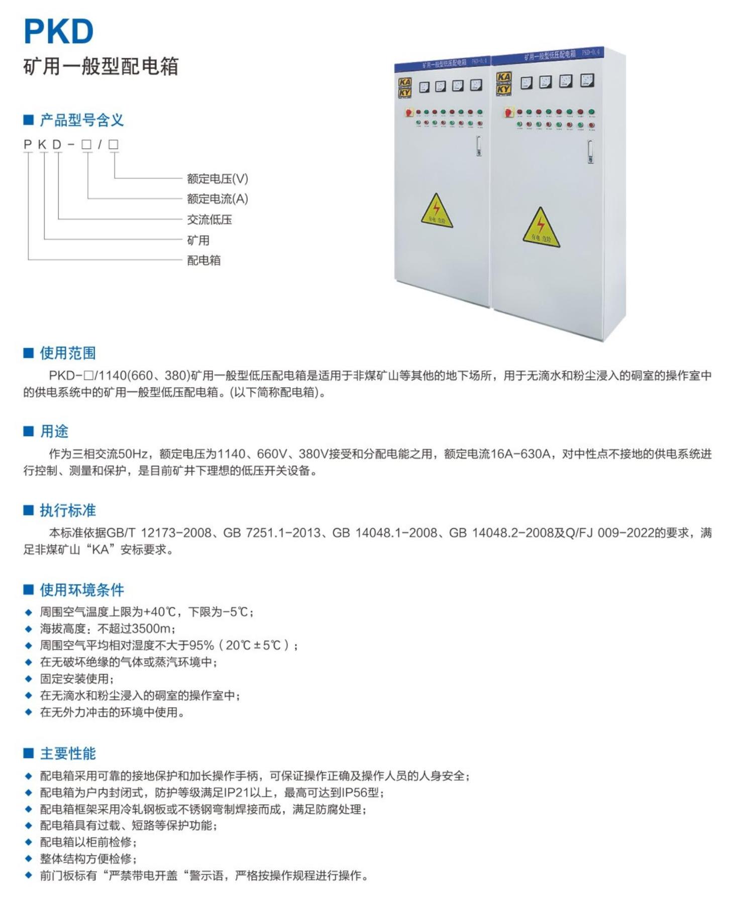 PKD-□/1140(660、380) 矿用一般型低压配电箱是适用于非煤矿山等其他的地下场所,用于无滴水和粉尘浸入的硐室的操作室中 的供电系统中的矿用一般型低压配电箱